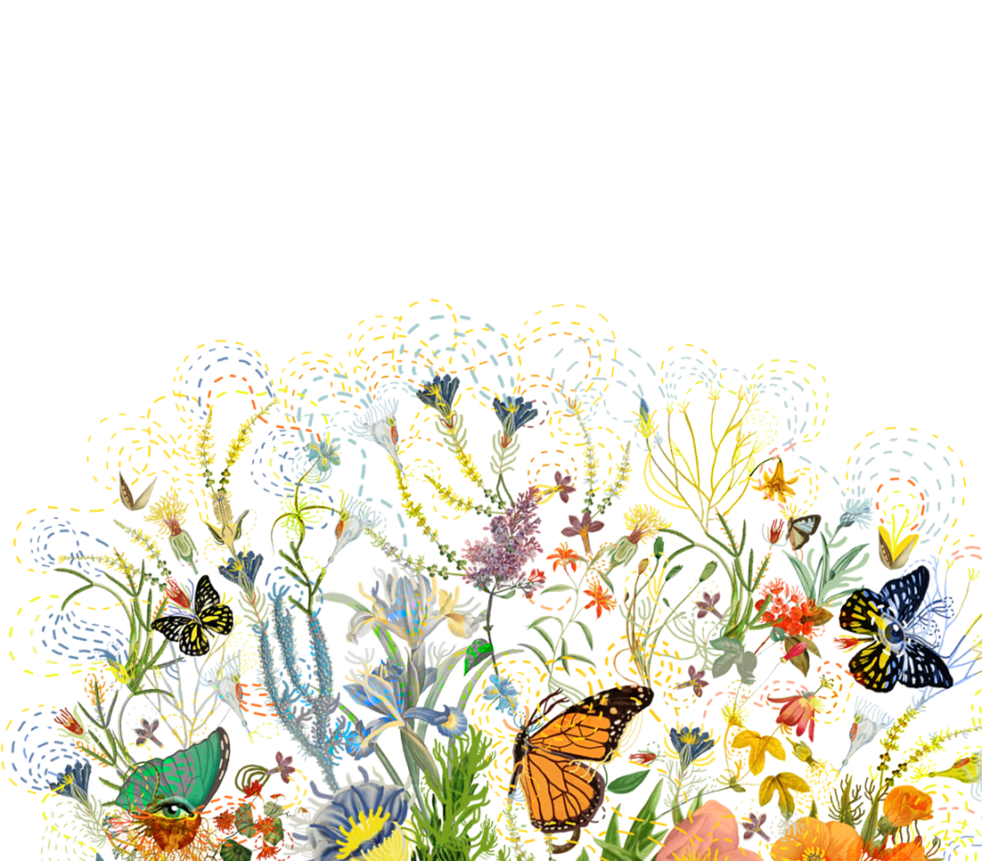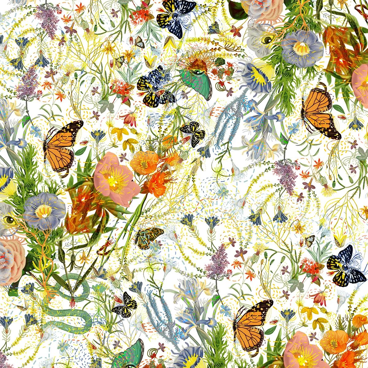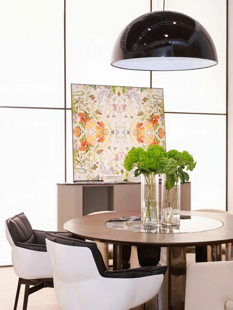 Paola以春日意大利花園為藍本,描繪了一個和諧靜謐的烏托邦:絢爛生長的鳶尾、木槿、牡丹,隨風搖曳的枝蔓,沐浴在陽光下翩躚起舞的蝴蝶,交織鏈接的虛幻線條,共同構成生機勃勃的能量場,為家注入不斷繁衍生長的生命力與治愈力。